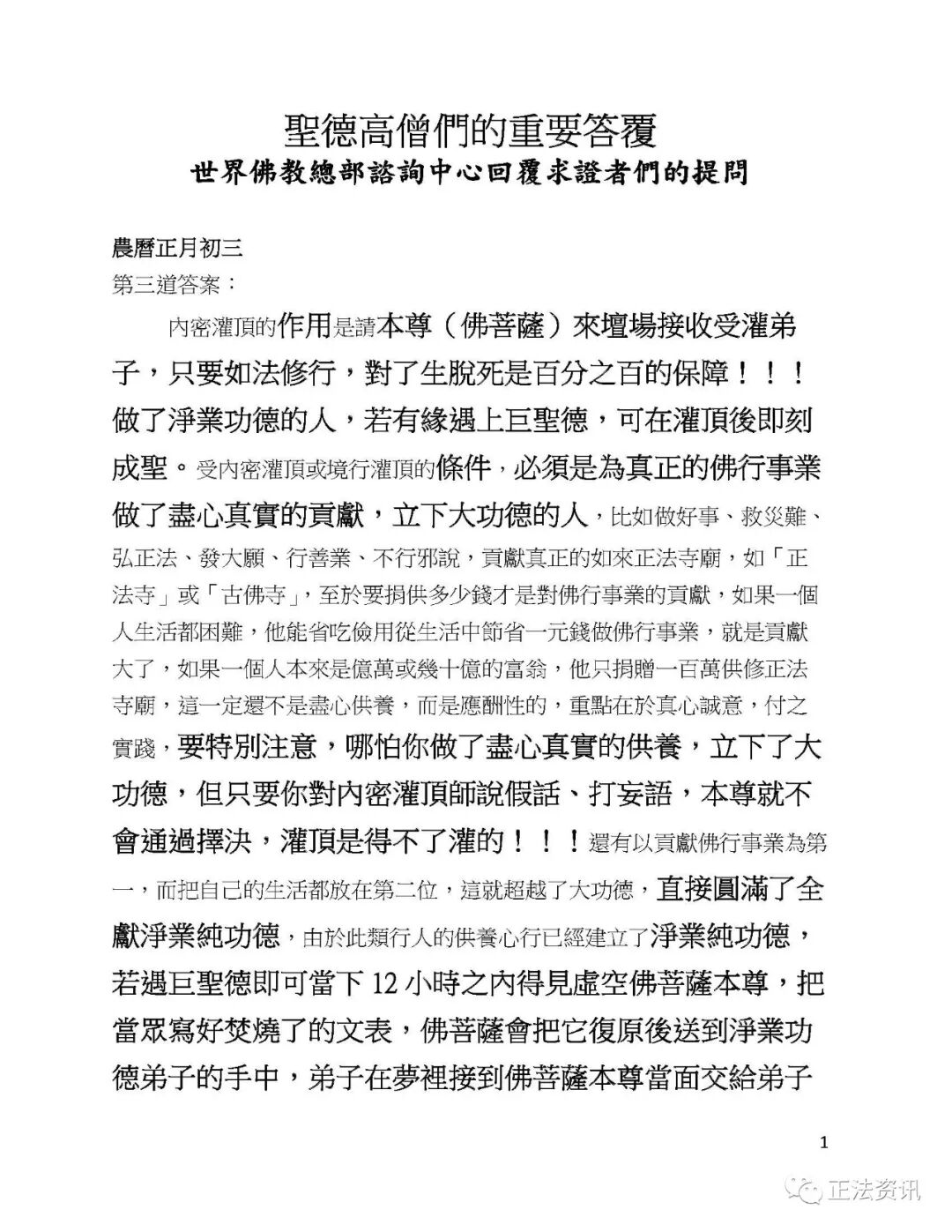 內密灌頂的作用是請本尊(佛菩薩)來壇場接收受灌弟子,只要如法修行,對了生脫死是百分之百的保障! ! !做了淨業功德的人,若有緣遇上巨聖德,可在灌頂後即刻成聖。受內密灌頂或境行灌頂的條件,必須是為真正的佛行事業做了盡心真實的貢獻,立下大功德的人,比如做好事、救災難、弘正法、發大願、行善業、不行邪說,貢獻真正的如來正法寺廟,如「正法寺」或「古佛寺」,至於要捐供多少錢才是對佛行事業的貢獻,如果一個人生活都困難,他能省吃儉用從生活中節省一元錢做佛行事業,就是貢獻大了,如果一個人本來是億萬或幾十億的富翁,他只捐贈一百萬供修正法寺廟,這一定還不是盡心供養,而是應酬性的,重點在於真心誠意,付之實踐,要特別注意,哪怕你做了盡心真實的供養,立下了大功德,但只要你對內密灌頂師說假話、打妄語,本尊就不會通過擇決,灌頂是得不了灌的! ! !還有以貢獻佛行事業為第一,而把自己的生活都放在第二位,這就超越了大功德,直接圓滿了全獻淨業純功德,由於此類行人的供養心行已經建立了淨業純功德,若遇巨聖德即可當下12小時之內得見虛空佛菩薩本尊,把當眾寫好焚燒了的文表,佛菩薩會把它復原後送到淨業功德弟子的手中,弟子在夢裡接到佛菩薩本尊當面交給弟子的文表後,醒來之後手中就會拿著文表,此表是當著眾人所寫好的表,而當時就火化燒掉,卻又由佛菩薩將它復原,在夢中交給弟子,而弟子醒後手中一定拿著這道文表,有這道佛菩薩親自送給淨業功德人的文表,這位至誠弟子必然受到本尊法緣一品灌頂,接著送菩薩一表後,受至寶甘露,就圓滿頓超直入成聖,但必須依戒行持! ! !大悲為本利生。在2018年國曆2月中旬,於美國聖寺,本來主題是大家要接受格蘭德謙釋勒玉尊和旺扎上尊、莫知尊者等團聚慶年,而就在當時主題緣變,在很多人集合的公眾場合之下,出現了一位發心堅固、淨業功德供養巨聖德的人,當天她堅決要寧捨一切財產生命供養巨聖德,而不是供養常規聖德羅漢菩薩,雖然巨聖德拒絕,分文沒有收,但此善德弟子的真心淨業功德感動了巨聖德,巨聖德說:「你看得起我,給了我這麽厚的禮,這一世我是第一次遇上如此真心虔誠的佛弟子,記住我永遠也不會接收你一分錢的供養,但是你的純淨心意我和佛菩薩收下了,依法我當送你一份回贈禮,我的禮是今晚下半夜一點至五點之間,會有菩薩本尊從虛空來到你的住所跟你見面。」眾行人頓時譁然震驚,巨聖德當公眾寫好的文表讓大家看好後火化,果然晚上約四點鐘金色菩薩光燦爛駕臨,將當眾手寫火化後的文表送到了該睡夢裡的弟子手中,醒來自己手中拿著火化後復原的文表,完全如上所說的顯境相同,座場四眾弟子比丘、比丘尼、優婆塞、優婆夷,親自從頭到尾目睹此稀世難遇的聖境空前「本尊法緣一品灌頂」的第一部前奏。