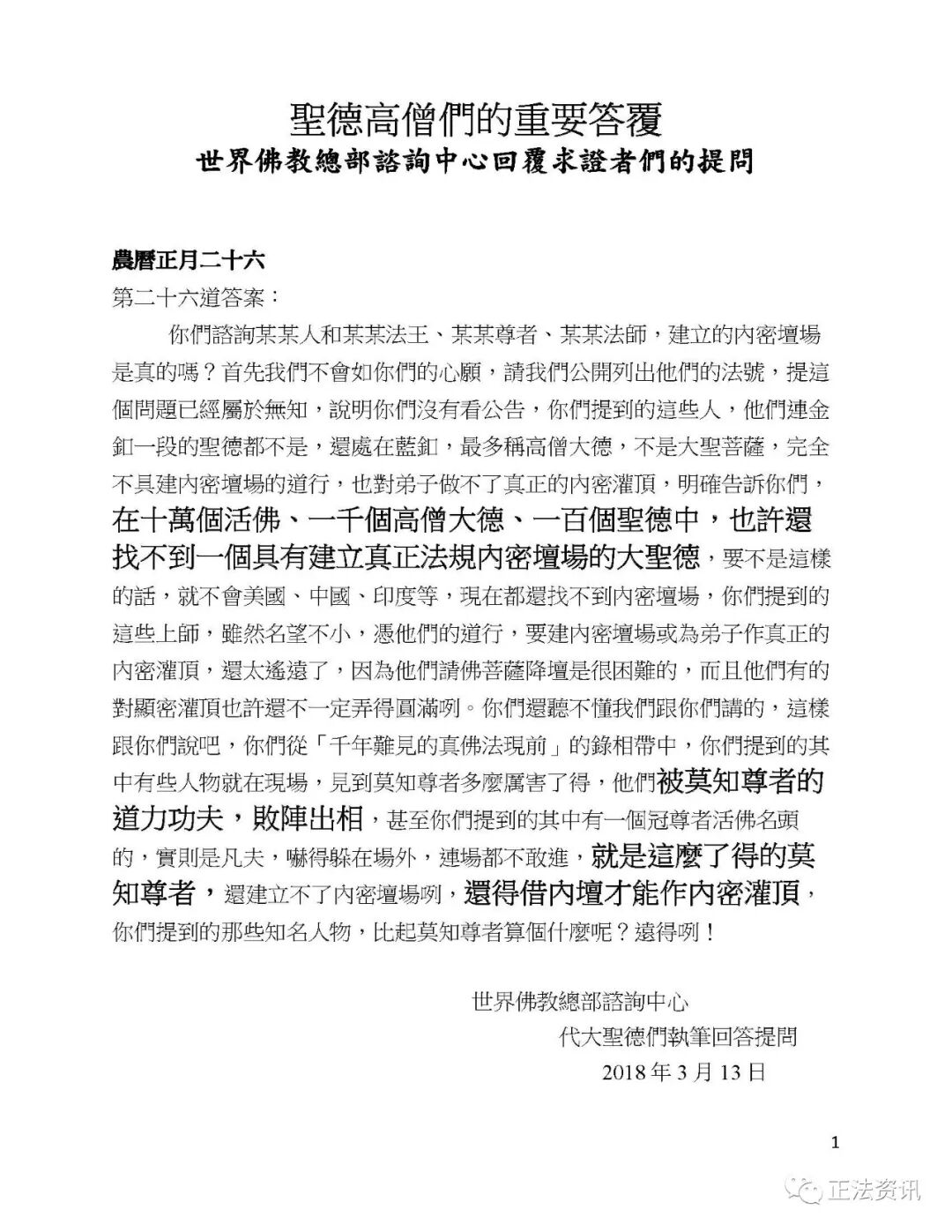 你們諮詢某某人和某某法王、某某尊者、某某法師, 建立的內密壇場是真的嗎?首先我們不會如你們的心願, 請我們公開列出他們的法號,提這個問題已經屬於無知, 說明你們沒有看公告,你們提到的這些人, 他們連金釦一段的聖德都不是,還處在藍釦,最多稱高僧大德, 不是大聖菩薩,完全不具建內密壇場的道行, 也對弟子做不了真正的內密灌頂,明確告訴你們,在十萬個活佛、 一千個高僧大德、一百個聖德中, 也許還找不到一個具有建立真正法規內密壇場的大聖德, 要不是這樣的話,就不會美國、中國、印度等, 現在都還找不到內密壇場,你們提到的這些上師,雖然名望不小, 憑他們的道行,要建內密壇場或為弟子作真正的內密灌頂, 還太遙遠了,因為他們請佛菩薩降壇是很困難的, 而且他們有的對顯密灌頂也許還不一定弄得圓滿咧。 你們還聽不懂我們跟你們講的,這樣跟你們說吧,你們從「 千年難見的真佛法現前」的錄相帶中, 你們提到的其中有些人物就在現場,見到莫知尊者多麼厲害了得, 他們被莫知尊者的道力功夫,敗陣出相, 甚至你們提到的其中有一個冠尊者活佛名頭的,實則是凡夫, 嚇得躲在場外,連場都不敢進,就是這麼了得的莫知尊者,還建立不 了內密壇場咧,還得借內壇才能作內密灌頂, 你們提到的那些知名人物,比起莫知尊者算個什麼呢?遠得咧!