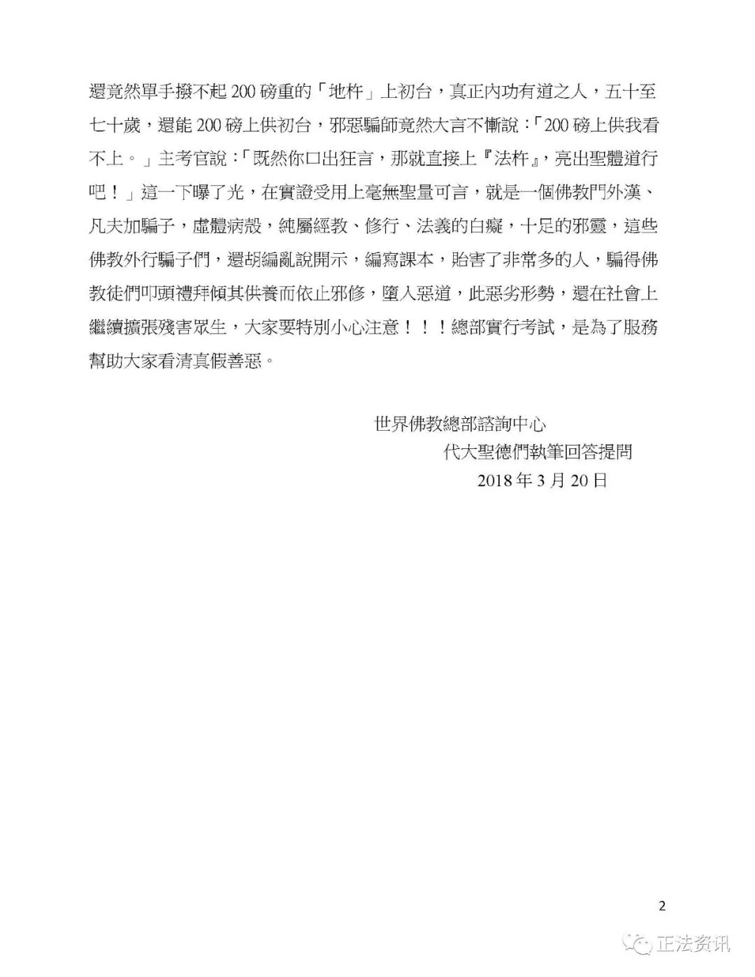 世界佛教總部實行考試制的目的,是為了幫助佛教徒尋訪到真正有德有道的良師益友,避免走偏路,現在末法時期,偽假之師竄遍四面八方,而都是打著自己是大聖者、大菩薩的牌子行騙,作為初學佛修行的人,由於欠缺佛教知識,對真正的佛法行持更是門都沒有入,所以百分之九十幾的人都會上當受騙,可惡的是邪惡之師還要他們發誓賭咒效忠不變,不准另跟他師,這類邪師騙子禽獸般猖毒,嚴重違背釋迦牟尼佛教戒,因此世界佛教總部為了幫助佛教徒避免上當受騙,只有對真假之師們的程度施行考試,來保障大家,世界佛教總部主席祿東贊法王說:「我做為主席實行考試,沒有絲毫的念頭是為我自己,包括新任主席莫知尊者也沒有私心,我們兩個不收弟子,是全心為大家服務,不是要大家跟我們學,只要是高僧大德,你們都可以去依止。」我發現往往以凡夫充聖冒充大菩薩的那些人,基本上都是藍扣或者什麼扣也沒有的人物,一個也沒有考上金扣段位,他們不但不是菩薩,連阿羅漢的邊都沾不上,沒有絲毫聖德的道行、品質,甚至沒有一點高僧大德的學識、品德,因此這些以凡充聖之人,才無道、無德、亂倫、欺騙,他們就是活脫脫殘害眾生的邪靈,這類人都是凡夫加騙子,經過總部的經律論實證書面答卷的考試,事實已經證明,平常騙得弟子們五體投地的所謂大菩薩、聞名響世的大活佛上師,在經律論考試中卻成了經教外行,很多人的答捲風馬牛不相及,錯誤連篇,還虛吹自己有聖證量內功,身體好到大力金剛不壞,結果經過考試發現體力衰竭,身體虛弱,二十至五十歲的人,還竟然單手撥不起200磅重的「地杵」上初台,真正內功有道之人,五十至七十歲,還能200磅上供初台,惡騙師竟然大言不慚說:「200磅上供我看不上。」主考官說:「既然你口出狂言,那就直接上『法杵』,亮出聖體道行吧!」這一下曝了光,在實證受用上毫無聖量可言,就是一個佛教門外漢、凡夫加騙子,虛體病殼,純屬經教、修行、法義的白痴,十足的邪靈,這些佛教外行騙子們,還胡編亂說開示,編寫課本,貽害了非常多的人,騙得佛教徒們叩頭禮拜傾其供養而依止邪修,墮入惡道,此惡劣形勢,還在社會上繼續擴張殘害眾生,大家要特別小心注意! ! !總部實行考試,是為了服務幫助大家看清真假善惡。