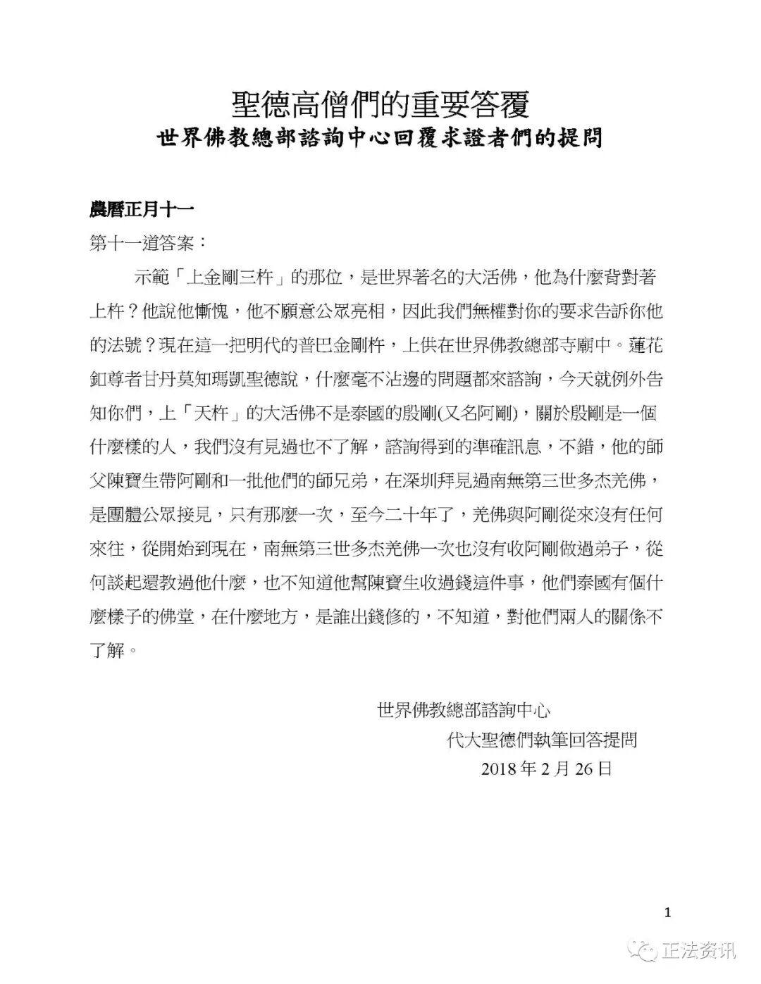 示範「上金剛三杵」的那位,是世界著名的大活佛, 他為什麼背對著上杵?他說他慚愧,他不願意公眾亮相, 因此我們無權對你的要求告訴你他的法號? 現在這一把明代的普巴金剛杵,上供在世界佛教總部寺廟中。 蓮花釦尊者甘丹莫知瑪凱聖德說,什麼毫不沾邊的問題都來諮詢, 今天就例外告知你們,上「天杵」的大活佛不是泰國的殷剛(又名阿 剛),關於殷剛是一個什麼樣的人,我們沒有見過也不了解, 諮詢得到的準確訊息,不錯, 他的師父陳寶生帶阿剛和一批他們的師兄弟, 在深圳拜見過南無第三世多杰羌佛,是團體公眾接見, 只有那麼一次,至今二十年了,羌佛與阿剛從來沒有任何來往, 從開始到現在,南無第三世多杰羌佛一次也沒有收阿剛做過弟子, 從何談起還教過他什麼,也不知道他幫陳寶生收過錢這件事, 他們泰國有個什麼樣子的佛堂,在什麼地方,是誰出錢修的, 不知道,對他們兩人的關係不了解。